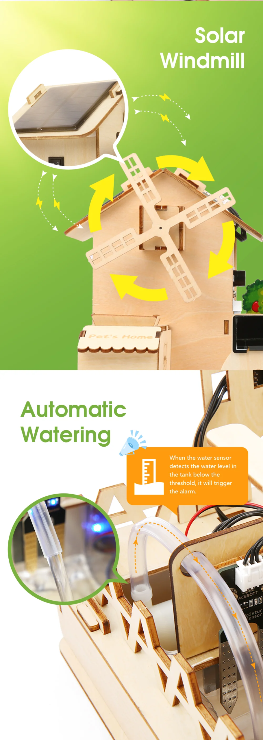 - Solar güç uygulaması (solar rüzgar türbini) ile yenilenebilir enerji farkındalığı kazandırır.