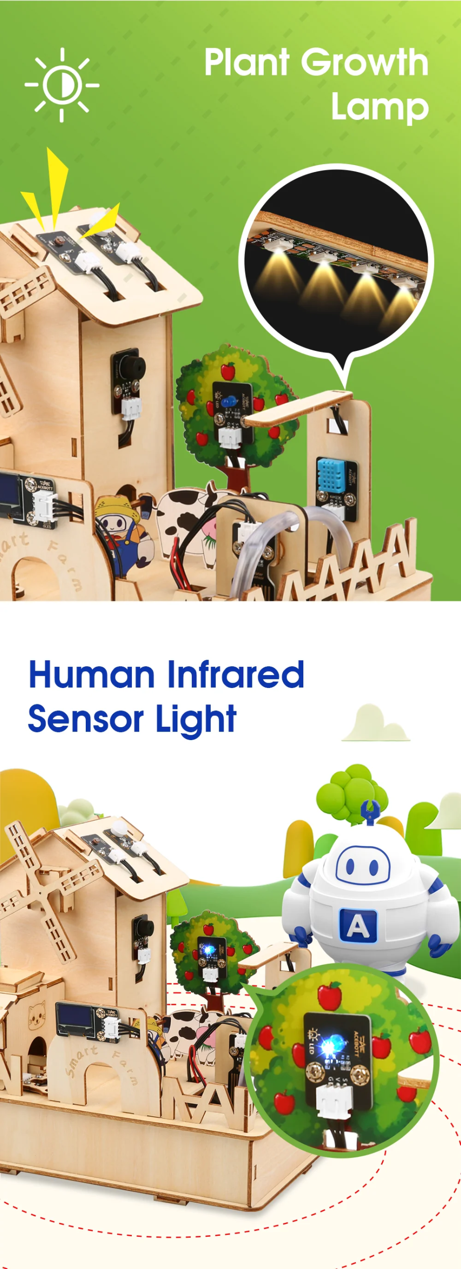 Acebott ESP32 Uyumlu IoT Wi-Fi Akıllı Tarım (Ahşap Ev) Başlangıç Seti (Model: QE002), çocuklar ve gençler için Akıllı Tarım senaryolarını ESP32 tabanlı IoT altyapısıyla somutlaştıran, modüler bir STEM eğitim kitidir.Wi-Fi üzerinden uzaktan kontrol ve sensör verisi izleme gibi modern tarım otomasyonu mantığını; ev, okul ve atölye ortamında uygulamalı şekilde öğretir.
